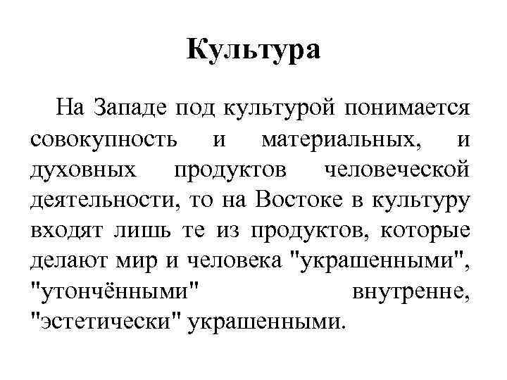 Культура На Западе под культурой понимается совокупность и материальных, и духовных продуктов человеческой деятельности, то на Востоке в культуру входят лишь те из продуктов, которые делают мир и человека "украшенными", "утончёнными" внутренне, "эстетически" украшенными.