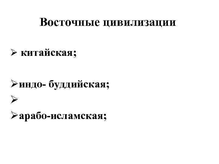 Восточные цивилизации Ø китайская; Øиндо- буддийская; Ø Øарабо-исламская;