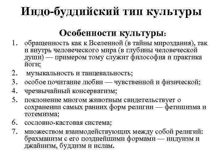 Индо-буддийский тип культуры Особенности культуры: 1. обращенность как к Вселенной (в тайны мироздания), так и внутрь человеческого мира (в глубины человеческой души) — примером тому служит философия и практика йоги; 2. музыкальность и танцевальность; 3. особое почитание любви — чувственной и физической; 4. чрезвычайный консерватизм; 5. поклонение многом животным свидетельствует о сохранении самых ранних форм религии — фетишизма и тотемизма; 6. сословно кастовая система; 7. множеством взаимодействующих между собой религий: брахманизм с его позднейшими формами — индуизм и джайнизм, буддизм и ислам.