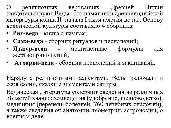 О религиозных верованиях Древней Индии свидетельствуют Веды это памятники древнеиндийской литературы конца II начала I тысячелетия до н. э. Основу веддической культуры составляло 4 сборника: • Риг-веда книга о гимнах; • Сама-веда сборник ритуалов и песнопений; • Яджур-веда молитвенные формулы для жертвоприношений; • Атхарва-веда сборник песнопений и заклинаний. Наряду с религиозными аспектами, Веды включали в себя басни, сказки с элементами сатиры. Ведическая литература содержит сведения из различных областей знания: земледелия (удобрение, шелководство), медицины (перечень болезней, 760 лечебных снадобий), а также сведения об анатомии, геометрии, астрономии, о военном деле.
