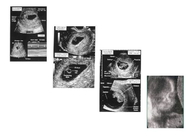 Ultrasonography • • The pregnancy sac can be detected at 4 -5 weeks. The gestational ring is detected universally at 6 weeks. The embryonic echo can be seen at 7 weeks. The fetal heart can be detected at 8 weeks. – – Vaginal ultrasonography can detect a pregnancy sac of 2 mm at about 16 days gestation and fetal heart at 6 weeks. Also, the fetal heart sounds can be heard after the 10 th week by the doppler (Sonicaid).