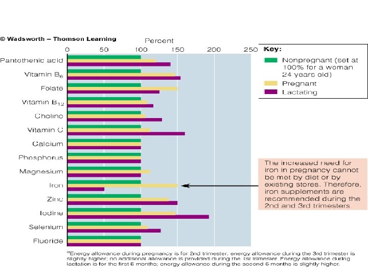 Vitamins and Minerals Iron is the only nutrient for which requirements are not met by diet alone. Routine multivitamin is not recommended as any general diet supplies the required vitamins but women who do not consume an adequate diet need a supplement containing iron, zinc, copper, calcium, vitamin B 6, folate, vitamin C vitamin D. – Iron: • • • Daily requirement is 30 -60 mg. As Normal diet contains about 15 mg, One gram of iron is needed. – – – • • • 300 for the fetus and placenta, 500 for the increased blood volume and 200 for the uterus. 7 mg per day are needed 30 mg of a simple iron salt as ferrous sulphate, gluconate, fumarate once daily provides sufficient iron. 60 -100 mg are needed if the woman is large, has twins takes iron irregularly. Anemic women need 200 mg in divided doses. Calcium and magnesium in multivitamins reduces iron absorption so iron is best given alone iron is not needed in the first 4 months if there is no anemia. Given at bedtime is better.