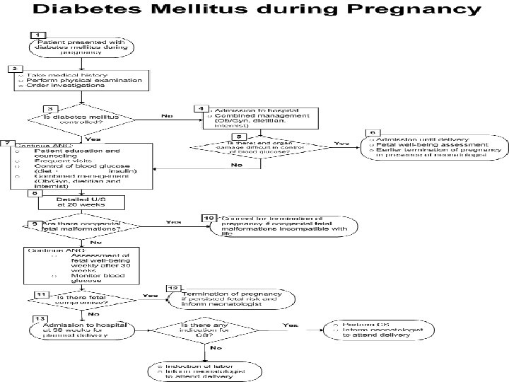 Determination of GDM (ACOG, 1994) 100 Grams OGTT (3 hrs) 75 Grams OGTT (2 hrs) Fasting 1 hour 2 hour 3 hour Ranges of Accepted Values 95 -105 180 -190 155 -165 140 -145 - If 2 or more values met or exceeded = GDM - Consuming at least 150 grams/day for the 3 days preceding the test with 8 hours overnight fasting