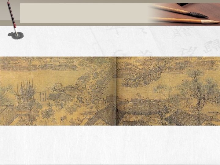 Riverside Scenes at Qingming Festival 《清明上河图》 • Riverside Scenes at Qingming Festiva is a marvelous hand-scroll of 5. 25 meters in length and 0. 24 meter in height by Zhang Zeduan(张择端), a master painter. It is a minute depiction of the scenery and life along a river in Bianliang(卞粱), the capital of Northern Song, on the day of Tomb Sweeping Festival. • This masterpiece is painted in ink with light colors and is full of surprising details. This painting also vividly depicts water, bridge, boats, streets, markets, carts, crowds and human figures. It is not only a wonderful work or art but also an invaluable record of history.
