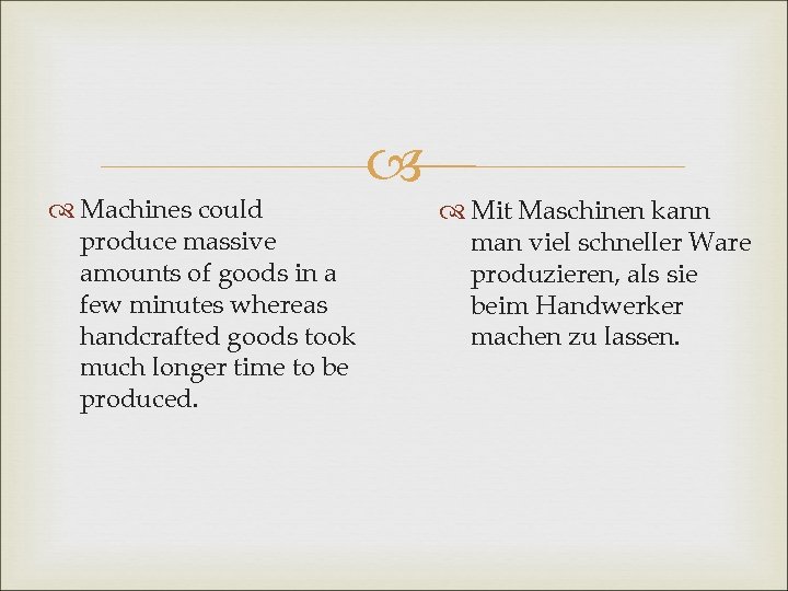 Machines could produce massive amounts of goods in a few minutes whereas handcrafted goods took much longer time to be produced. Mit Maschinen kann man viel schneller Ware produzieren, als sie beim Handwerker machen zu lassen.
