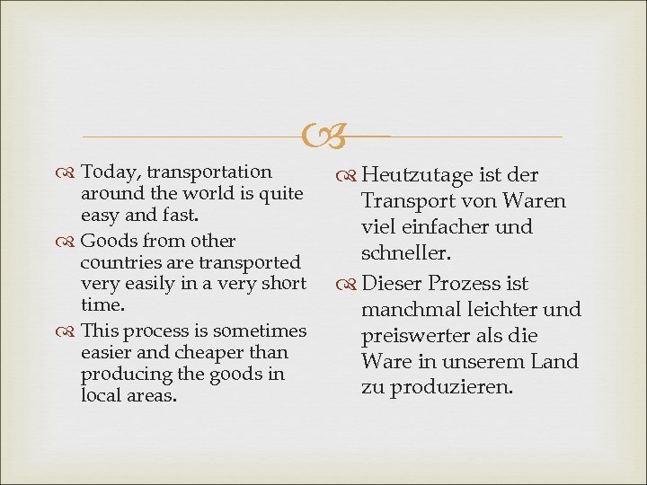 Today, transportation around the world is quite easy and fast. Goods from other countries are transported very easily in a very short time. This process is sometimes easier and cheaper than producing the goods in local areas. Heutzutage ist der Transport von Waren viel einfacher und schneller. Dieser Prozess ist manchmal leichter und preiswerter als die Ware in unserem Land zu produzieren.