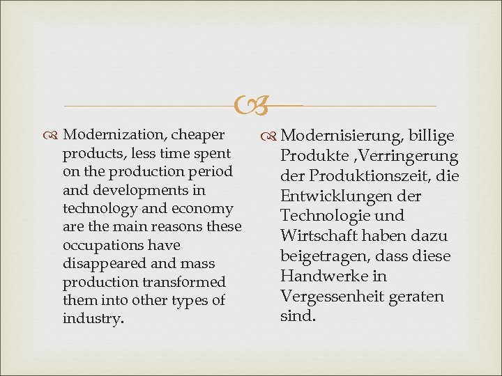 Modernization, cheaper products, less time spent on the production period and developments in technology and economy are the main reasons these occupations have disappeared and mass production transformed them into other types of industry. Modernisierung, billige Produkte , Verringerung der Produktionszeit, die Entwicklungen der Technologie und Wirtschaft haben dazu beigetragen, dass diese Handwerke in Vergessenheit geraten sind.