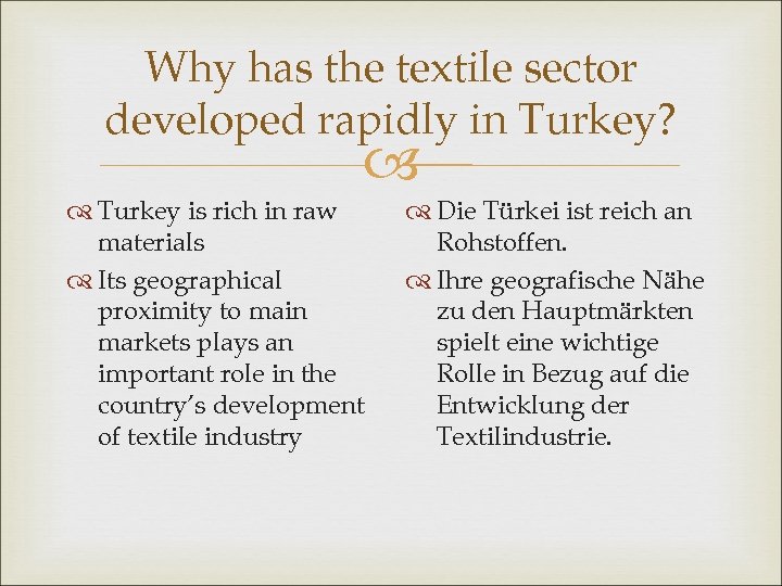 Why has the textile sector developed rapidly in Turkey? Turkey is rich in raw materials Its geographical proximity to main markets plays an important role in the country’s development of textile industry Die Türkei ist reich an Rohstoffen. Ihre geografische Nähe zu den Hauptmärkten spielt eine wichtige Rolle in Bezug auf die Entwicklung der Textilindustrie.