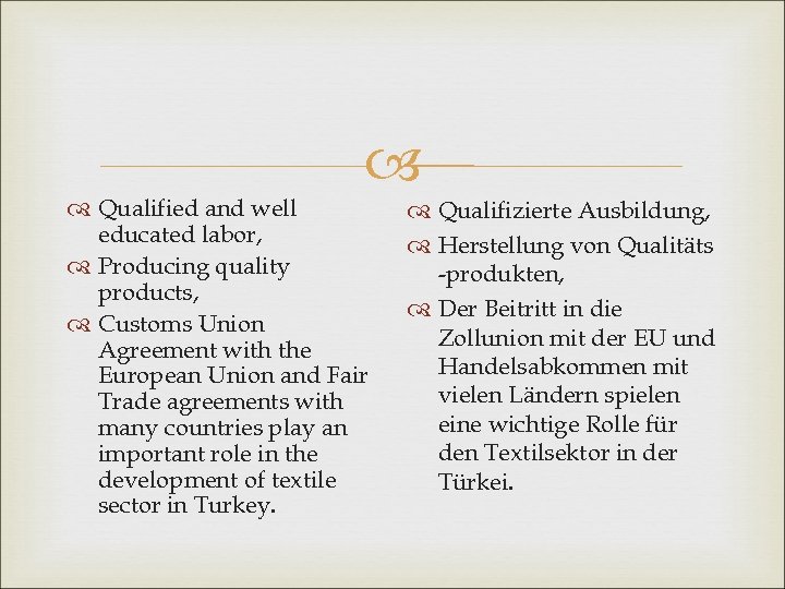 Qualified and well educated labor, Producing quality products, Customs Union Agreement with the European Union and Fair Trade agreements with many countries play an important role in the development of textile sector in Turkey. Qualifizierte Ausbildung, Herstellung von Qualitäts -produkten, Der Beitritt in die Zollunion mit der EU und Handelsabkommen mit vielen Ländern spielen eine wichtige Rolle für den Textilsektor in der Türkei.