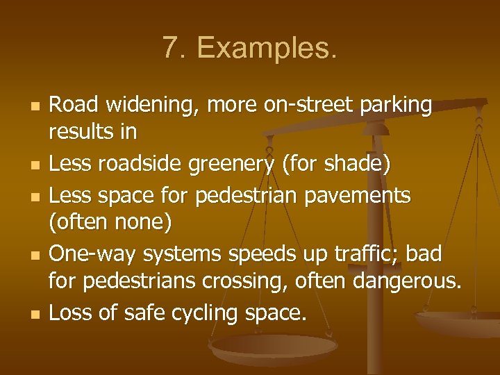 7. Examples. n n n Road widening, more on-street parking results in Less roadside greenery (for shade) Less space for pedestrian pavements (often none) One-way systems speeds up traffic; bad for pedestrians crossing, often dangerous. Loss of safe cycling space.