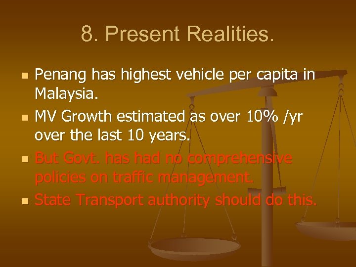 8. Present Realities. n n Penang has highest vehicle per capita in Malaysia. MV Growth estimated as over 10% /yr over the last 10 years. But Govt. has had no comprehensive policies on traffic management. State Transport authority should do this.