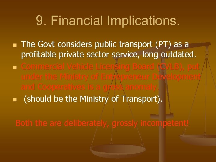 9. Financial Implications. n n n The Govt considers public transport (PT) as a profitable private sector service, long outdated. Commercial Vehicle Licensing Board (CVLB), put under the Ministry of Entrepreneur Development and Cooperatives is a gross anomaly. (should be the Ministry of Transport). Both the are deliberately, grossly incompetent!