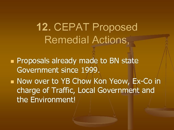 12. CEPAT Proposed Remedial Actions, n n Proposals already made to BN state Government since 1999. Now over to YB Chow Kon Yeow, Ex-Co in charge of Traffic, Local Government and the Environment!