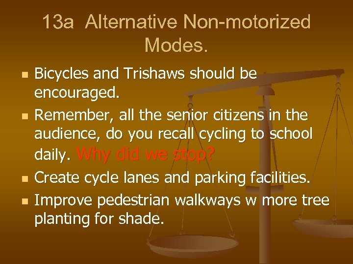 13 a Alternative Non-motorized Modes. n n Bicycles and Trishaws should be encouraged. Remember, all the senior citizens in the audience, do you recall cycling to school daily. Why did we stop? Create cycle lanes and parking facilities. Improve pedestrian walkways w more tree planting for shade.