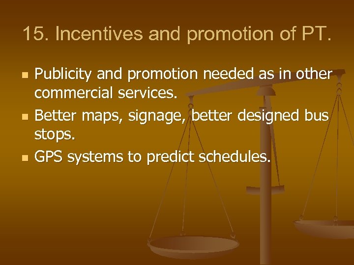 15. Incentives and promotion of PT. n n n Publicity and promotion needed as in other commercial services. Better maps, signage, better designed bus stops. GPS systems to predict schedules.