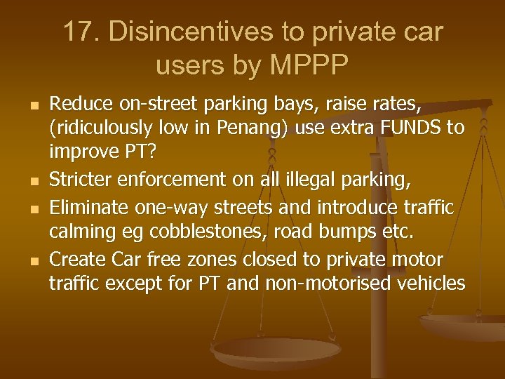 17. Disincentives to private car users by MPPP n n Reduce on-street parking bays, raise rates, (ridiculously low in Penang) use extra FUNDS to improve PT? Stricter enforcement on all illegal parking, Eliminate one-way streets and introduce traffic calming eg cobblestones, road bumps etc. Create Car free zones closed to private motor traffic except for PT and non-motorised vehicles