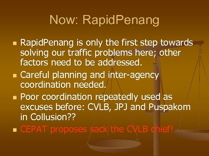 Now: Rapid. Penang n n Rapid. Penang is only the first step towards solving our traffic problems here; other factors need to be addressed. Careful planning and inter-agency coordination needed. Poor coordination repeatedly used as excuses before: CVLB, JPJ and Puspakom in Collusion? ? CEPAT proposes sack the CVLB chief!