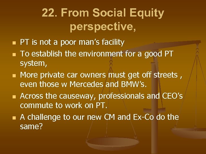 22. From Social Equity perspective, n n n PT is not a poor man’s facility To establish the environment for a good PT system, More private car owners must get off streets , even those w Mercedes and BMW’s. Across the causeway, professionals and CEO’s commute to work on PT. A challenge to our new CM and Ex-Co do the same?