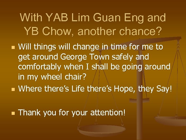 With YAB Lim Guan Eng and YB Chow, another chance? n Will things will change in time for me to get around George Town safely and comfortably when I shall be going around in my wheel chair? Where there’s Life there’s Hope, they Say! n Thank you for your attention! n