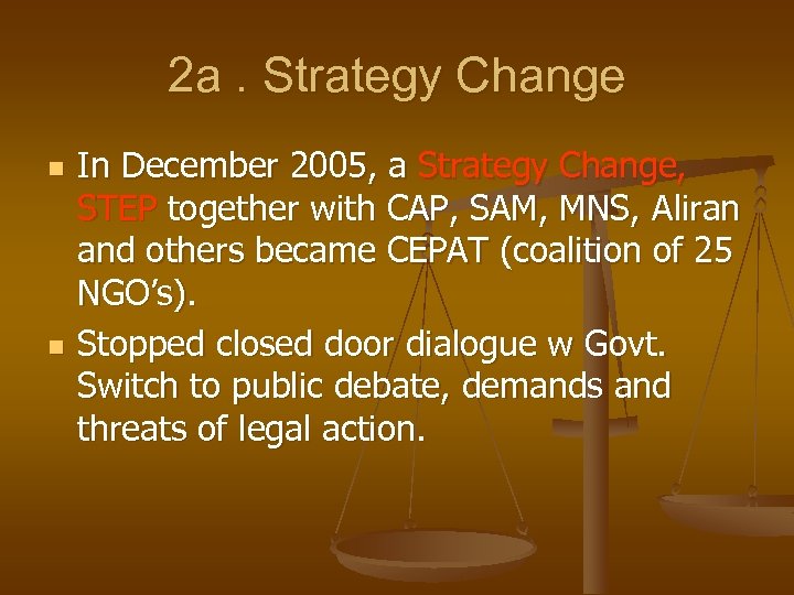 2 a. Strategy Change n n In December 2005, a Strategy Change, STEP together with CAP, SAM, MNS, Aliran and others became CEPAT (coalition of 25 NGO’s). Stopped closed door dialogue w Govt. Switch to public debate, demands and threats of legal action.