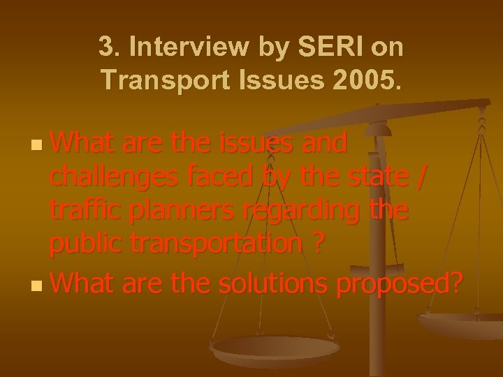 3. Interview by SERI on Transport Issues 2005. n What are the issues and challenges faced by the state / traffic planners regarding the public transportation ? n What are the solutions proposed?