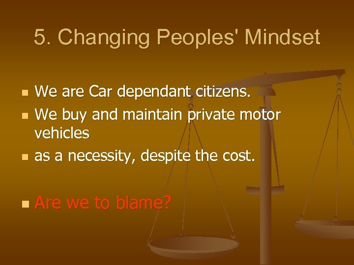 5. Changing Peoples' Mindset n We are Car dependant citizens. We buy and maintain private motor vehicles as a necessity, despite the cost. n Are we to blame? n n