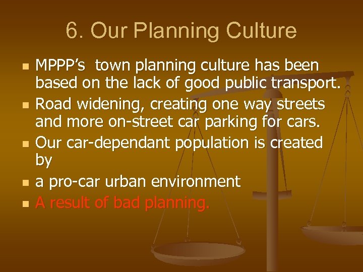 6. Our Planning Culture n n n MPPP’s town planning culture has been based on the lack of good public transport. Road widening, creating one way streets and more on-street car parking for cars. Our car-dependant population is created by a pro-car urban environment A result of bad planning.