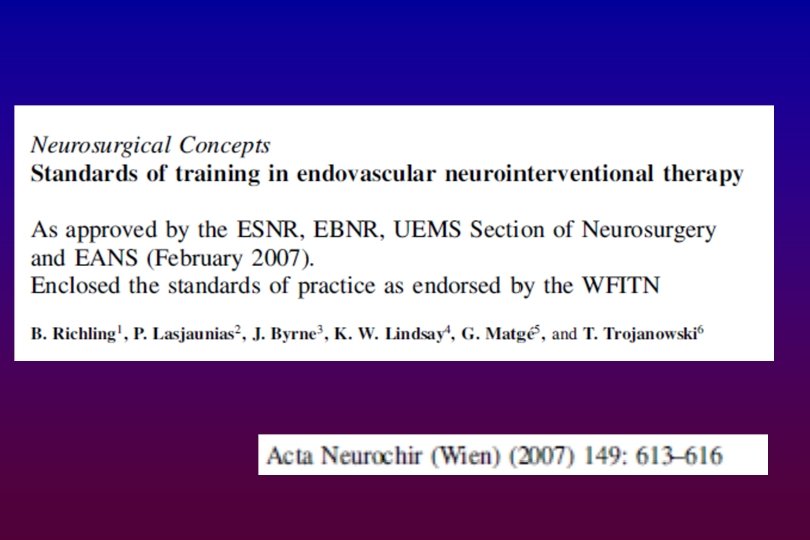 Training Charter in INR The process - participants: • Bernd Richling – Sect. of neurosurgery • Wolfgang Grisold – Sect of neurology • Laurent Pierot – Div. of neuroradiology Chairman: • Olof Flodmark – Div. of Neuroradiology