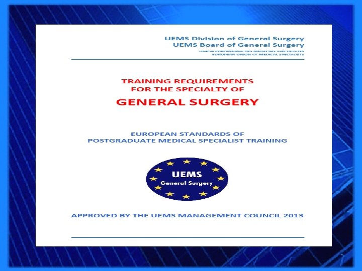 • Training program in Surgery only in eligible Hospitals • Responsible for trainees tutor in cooperation with the chairman of the Department • Training classified as basic and advanced, 3 years each • Number of procedures: 400 -750 ( minor, moderate, major) as a surgeon • Double the number for 1 st/2 nd assistance
