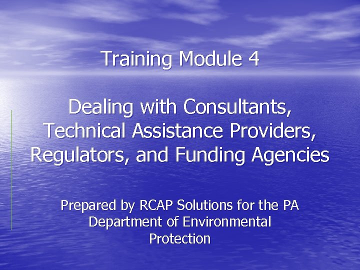 Training Module 4 Dealing with Consultants, Technical Assistance Providers, Regulators, and Funding Agencies Prepared by RCAP Solutions for the PA Department of Environmental Protection