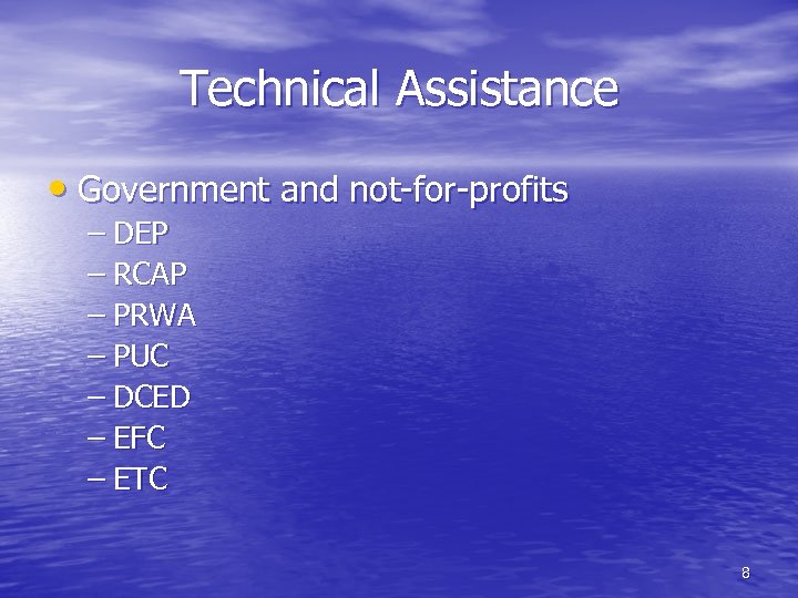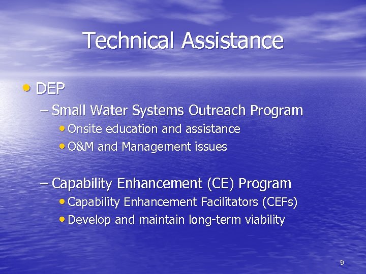 Technical Assistance • Government and not-for-profits – DEP – RCAP – PRWA – PUC – DCED – EFC – ETC 8