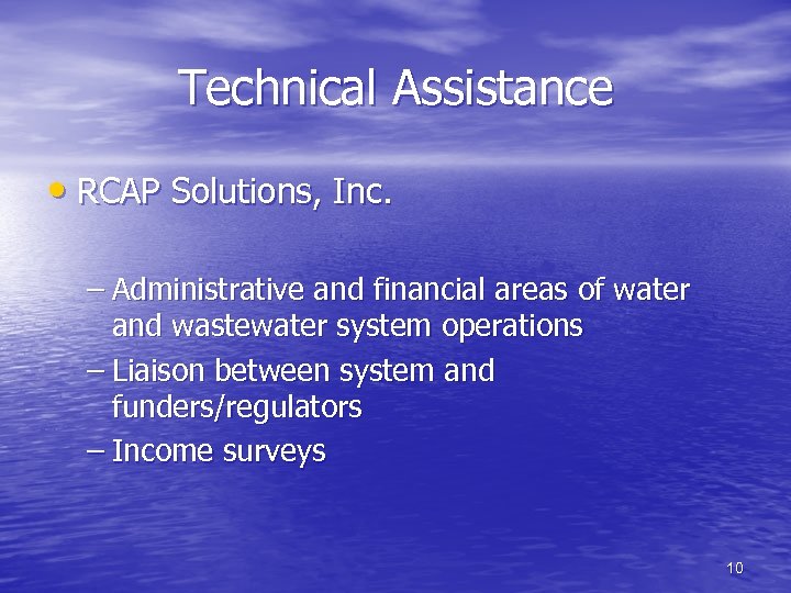 Technical Assistance • DEP – Small Water Systems Outreach Program • Onsite education and assistance • O&M and Management issues – Capability Enhancement (CE) Program • Capability Enhancement Facilitators (CEFs) • Develop and maintain long-term viability 9