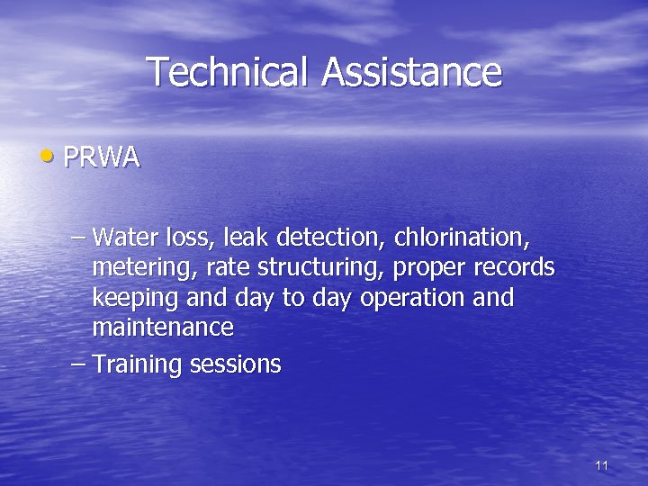 Technical Assistance • PRWA – Water loss, leak detection, chlorination, metering, rate structuring, proper records keeping and day to day operation and maintenance – Training sessions 11