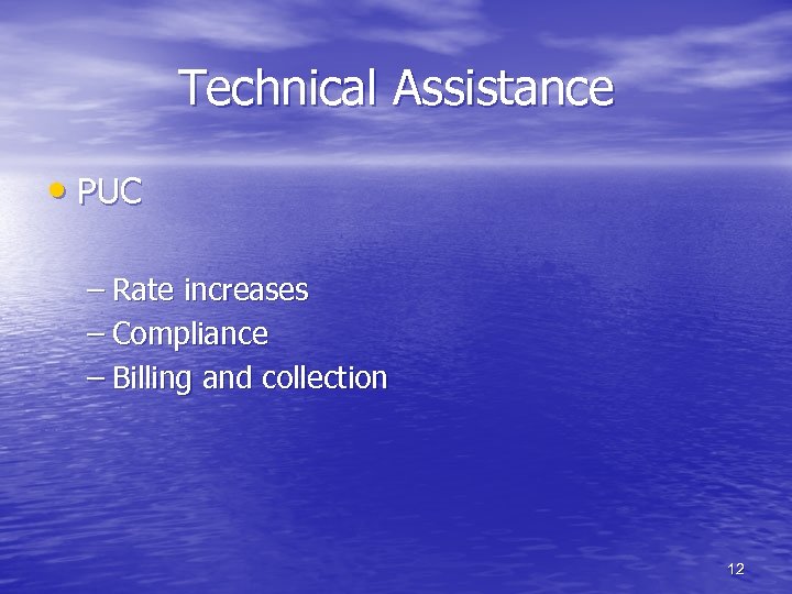 Technical Assistance • PUC – Rate increases – Compliance – Billing and collection 12