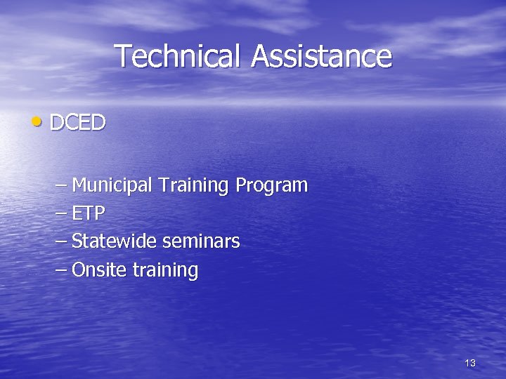 Technical Assistance • DCED – Municipal Training Program – ETP – Statewide seminars – Onsite training 13