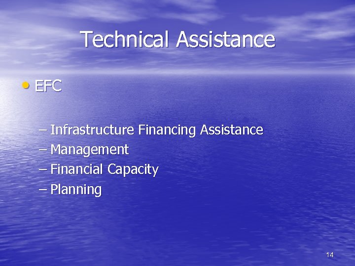 Technical Assistance • EFC – Infrastructure Financing Assistance – Management – Financial Capacity – Planning 14