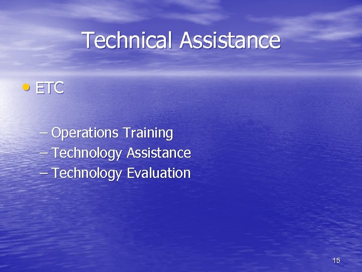 Technical Assistance • ETC – Operations Training – Technology Assistance – Technology Evaluation 15