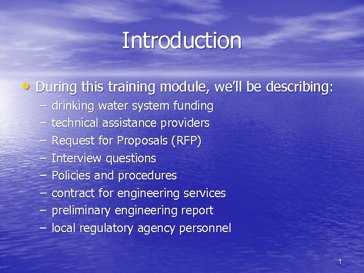 Introduction • During this training module, we’ll be describing: – – – – drinking water system funding technical assistance providers Request for Proposals (RFP) Interview questions Policies and procedures contract for engineering services preliminary engineering report local regulatory agency personnel 1
