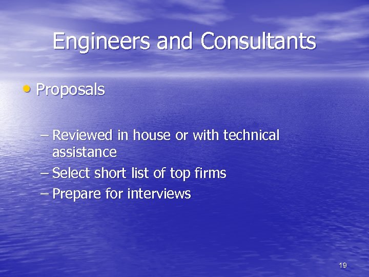 Engineers and Consultants • RFP – Developed in house or with technical assistance – Forms basis for the engineering work – Limit RFPs sent out 18