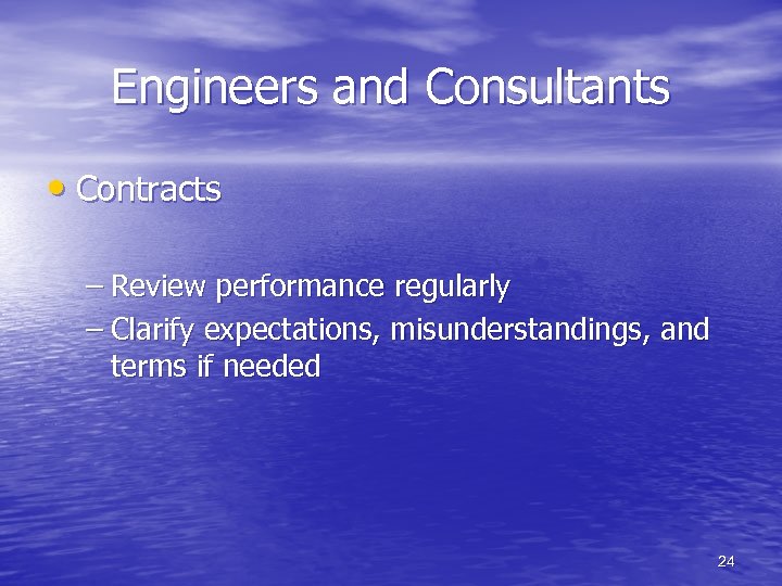 Engineers and Consultants • Contracts – Review performance regularly – Clarify expectations, misunderstandings, and terms if needed 24