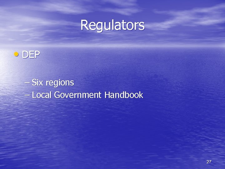 Regulators • DEP – Six regions – Local Government Handbook 27