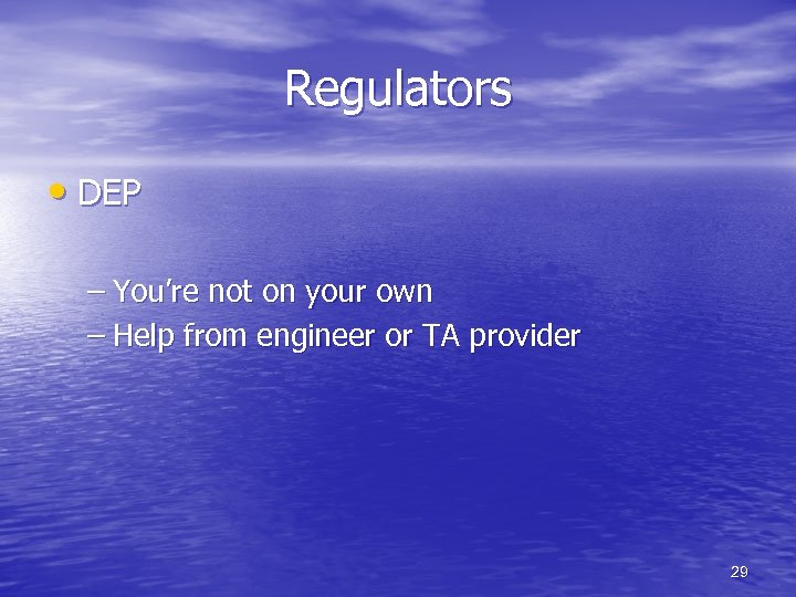 Regulators • DEP – You’re not on your own – Help from engineer or TA provider 29