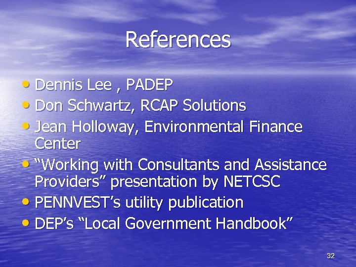 References • Dennis Lee , PADEP • Don Schwartz, RCAP Solutions • Jean Holloway, Environmental Finance Center • “Working with Consultants and Assistance Providers” presentation by NETCSC • PENNVEST’s utility publication • DEP’s “Local Government Handbook” 32