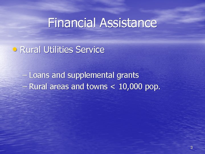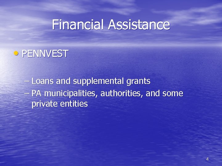 Financial Assistance • Rural Utilities Service – Loans and supplemental grants – Rural areas and towns < 10, 000 pop. 3
