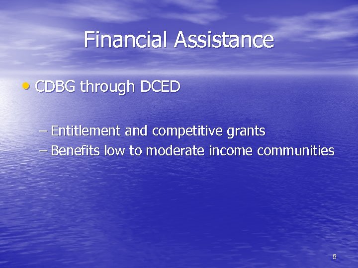 Financial Assistance • CDBG through DCED – Entitlement and competitive grants – Benefits low to moderate income communities 5