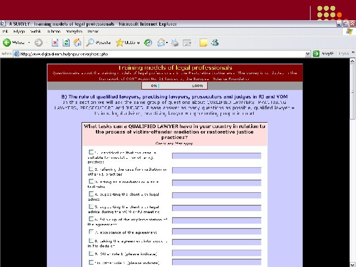 The SURVEY 1. The tasks and roles that the different legal practitioners can have in relation to victim-offender mediation or restorative justice 2. Different characteristics of the available training systems (obligatory – optional; graduate – postgraduate; training providers; content, etc. ); 3. Personal opinions l about legal professionals’ attitudes towards restorative justice; l about the importance of their training; l about the ways in which they could be more motivated in participating in trainings and in cooperating with restorative projects.