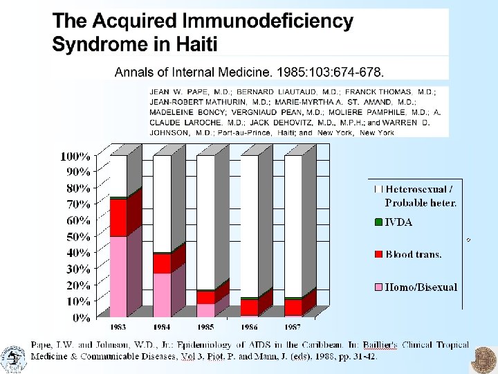 AIDS in Haiti : Scientific challenges 1982 -2008 l 1982 -1990: Define the disease – Can the common OIs be treated? – What are the modes of transmission and cofactors? – What is the natural history of HIV? l 1991 -2002: Can the epidemic be controlled? – Can a model for prevention and care be developed? – Can HAART be introduced? l 2003 -present: Nationwide scale-up of the prevention and model Research has been the backbone of the interventions