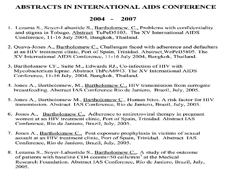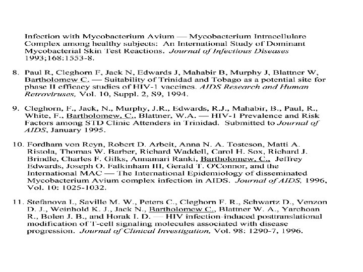 Pressing Clinical Issues Coccidia associated chronic diarrhea l TB: Diagnosis, Prevention, Treatment l Dermatologic presentations l Kaposi Sarcoma: Liautaud B, Pape JW, Laroche AC, et al. Sarcome de Kaposi et SIDA en Haiti. Nouvelles Dermatologiques 5 suppl) 1986; 80 -6. Bernard Liautaud MD Prurigo: A common initial manifestations of AIDS in Haiti. Liautaud B et al Arch. Derm, 123: 625, 1989