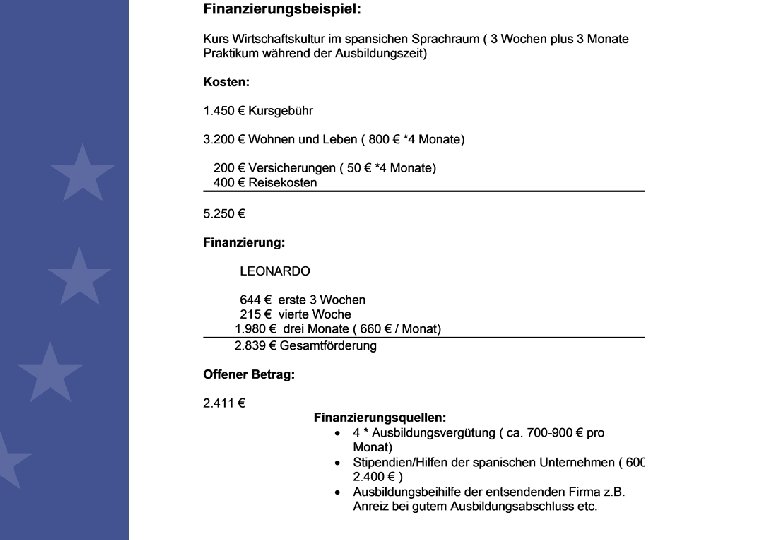 Finanzierungsbeispiel: Kurs Kaufmann für Spanien ( 3 Monate plus 3 Monate Praktikum nach der Ausbildung) Kosten: A 5. 700 € Kursgebühr 4. 800 € Wohnen und Leben ( 800 € *6 Monate) 300 € Versicherungen ( 50 € *6 Monate) 400 € Reisekosten 11. 200 € Finanzierung: LEONARDO 644 € ersten 3 Wochen 215 € vierte Woche 3. 300 € fünf Monate ( 660 € / Monat) 4. 159 € Gesamtförderung Offener Betrag: 7. 041 € Finanzierungsquellen: 600 -2. 400 € Stipendien der aufnehmenden Firma zumutbare Eigenleistung Teilnehmer 1. 000 € Rest Arbeitgeberdarlehen von 300 € *12 Monate oder (anteilig) Fortbildungsbeitrag der entsendenden Firma