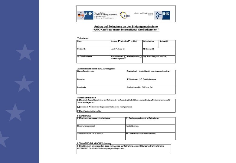 Ihre Ansprechpartner in Deutschland • für Großbritannien Industrie- und Handelskammer Aachen • Dr. Angelika Ivens • Theaterstraße 6 -10 • D – 52062 Aachen • Tel. +49 241 4460 -352 • Fax +49 241 4460 -314 • • E-Mail angelika. ivens@aachen. ihk. de Web ww. ausbildunginternational. de • für Spanien • • • Industrie- und Handelskammer Karlsruhe Josef Stößer Lammstraße 13 -17 D - 76133 Karlsruhe Tel. +49 170 6327653 Fax +49 721 174 279 • • E-Mail josef. stoesser@karlsruhe. ihk. de Web www. karlsruhe. ihk. de